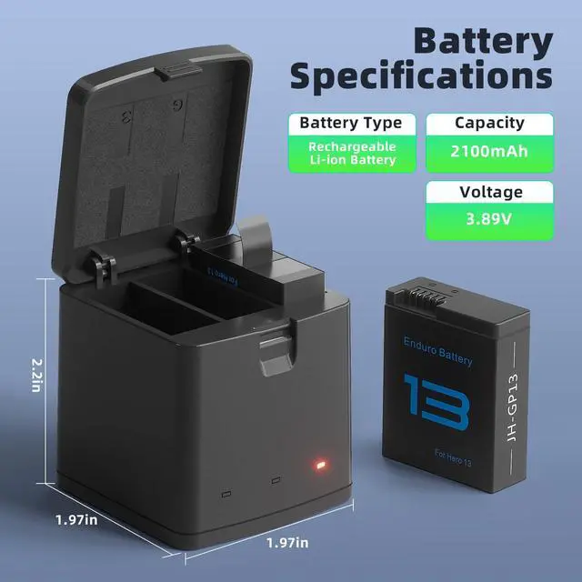 [Compatible Model] Battery and charger kit compatible with GoPro HERO 13 Black camera. 2100mAh large capacity provides long-lasting power support for your camera