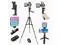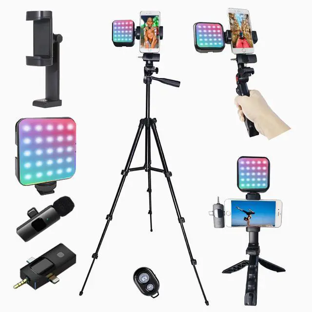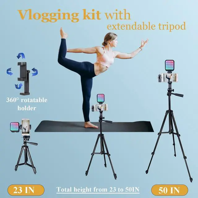 Vlogging kit with extendable tripod. The long tripod is used for shooting on the ground, with 1/4 bolts for connecting phone stands, cameras, etc. The tripod has 3 gears and can be extended or retracted in length. The total height of the product ranges from 23IN to 50IN, meeting the shooting needs of different heights.This phone holder is an upgraded version of the phone holder, which can rotate 360 degrees in all directions to achieve 360 degree shooting of the phone.