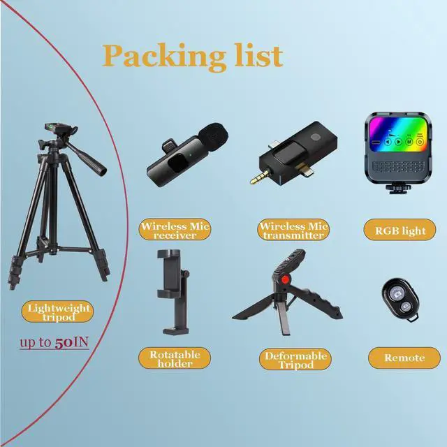 Vlogging kit with wireless mic.A wireless microphone has a transmitter and a receiver. Simply plug the receiver into your phone and turn on the power to both the receiver and transmitter to use it. It doesn't require any app, it links automatically. The effective distance of wireless microphone is about 20 meters, which can achieve clear sound transmission. It is more suitable for outdoor live streaming and food live streaming activities.