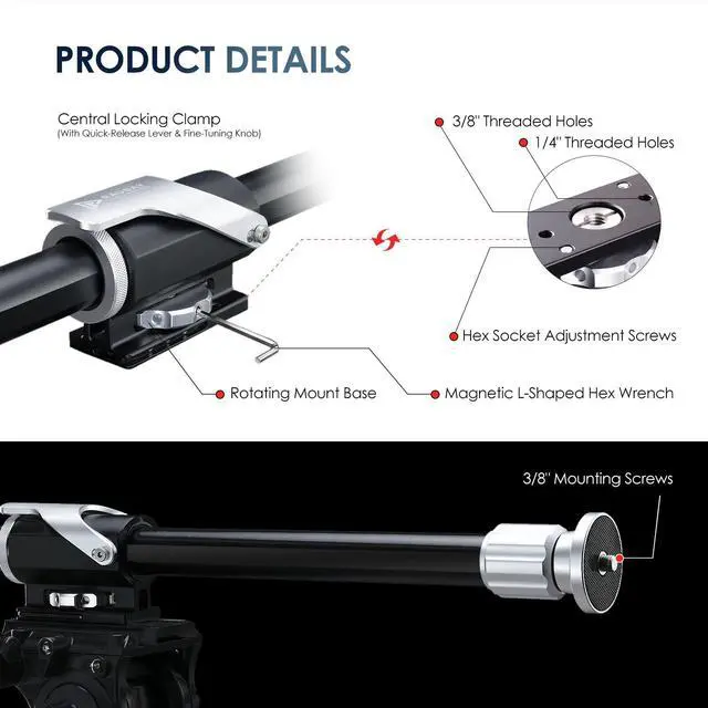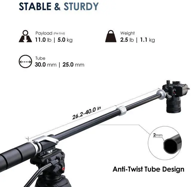 Heavy-Duty: Crafted from thickened CNC aluminum alloy, the tripod boom arm offers excellent rigidity and resistance to bending. Designed to securely support cameras, lights and accessories during extended overhead use.
