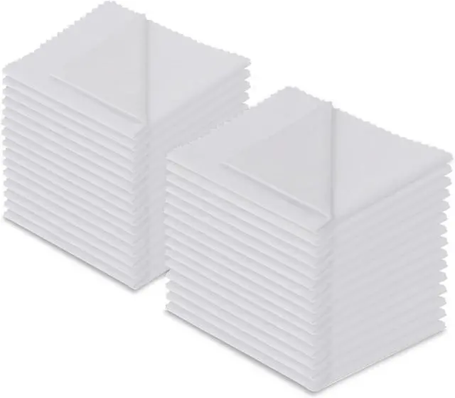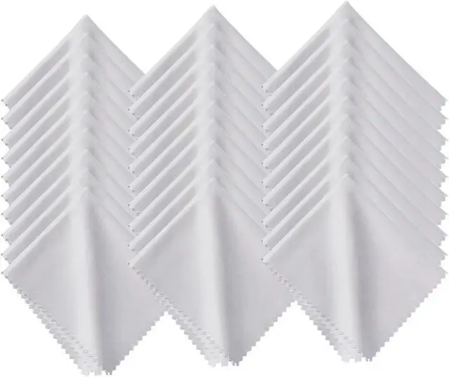 30-pack of white ultra-soft cleaning cloths made of high-quality tightly woven microfiber materialEach cloth measures 6 x 7 inches (15cm by 18cm) Contain no harsh chemicalsLint-free and streak-free performance saw-tooth pattern edges prevent fraying ensuring no coarse strings (wont scratch surfaces) Machine washable and reusableThere is no text pattern or logo on the cloths