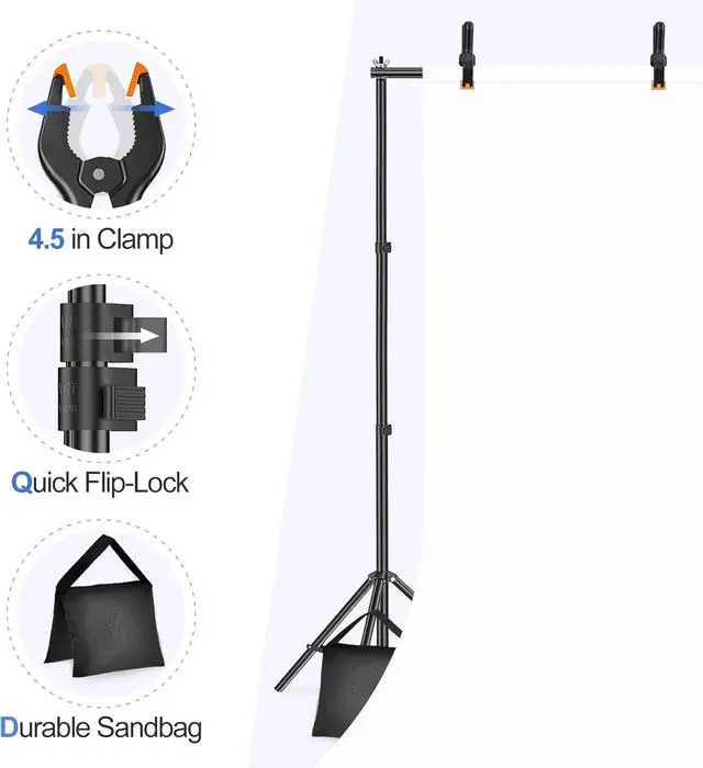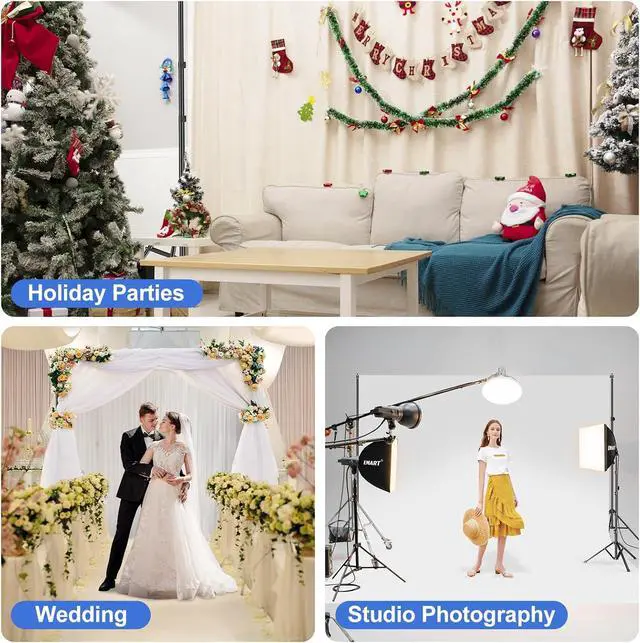 Sandbags can make the back drop stand more stable after loading heavy objects. (Fill sandbags with sand rocks soil etc... To improve the stability of the backdrop stand. )Portable and Compact The stand kit is very lightweight and portable after being put into the carry bag and will not take up too much space. It can be conveniently stored in the bedroom living room and corner. Multifunctional Application This backdrop stand kit is suitable for new year decorations newborn photography baby photo shoot professional photo studio shooting product display background DIY photo booth pet pictures shooting video or home/wedding/parties decoration.