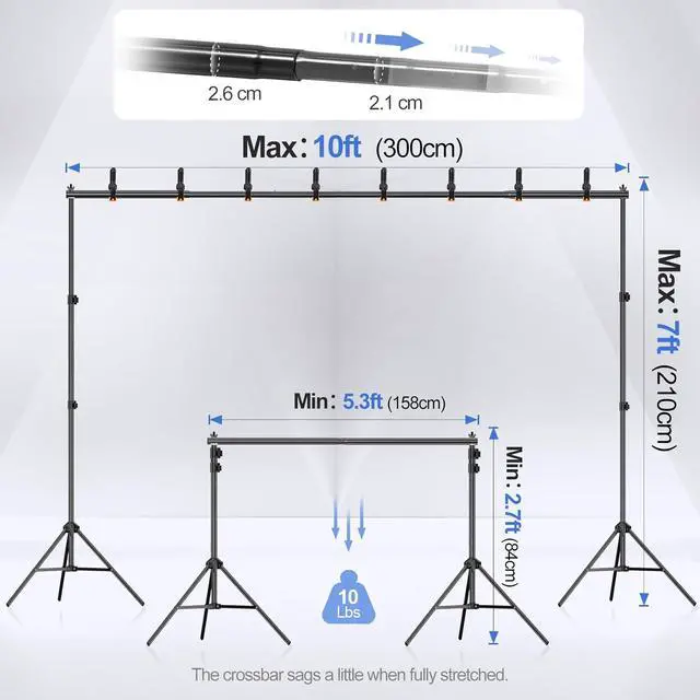 Retractable CrossbarThe retractable design makes the crossbar more flexible in use. Users can adjust to the appropriate width ( 5.3 ft/ 1.58 m10ft/3m) as required to adapt to different sizes of background backdrop. For a good decorative effect it is best not to hang objects over 10lbsSturdy Tripod Backdrop StandWith adjustable height ( 2.6 ft/ 0.8 m 7.0 ft/ 2.1 m) the aluminum alloy backdrop stand is durable and the design of the tripod base ensures it wont shake when fully extended to its maximum size. Better Effect with Accessories The clamp made of strong and rugged type of plastic matches with clips enable to clamp anything onto the stand tightly and present a better shooting effect.