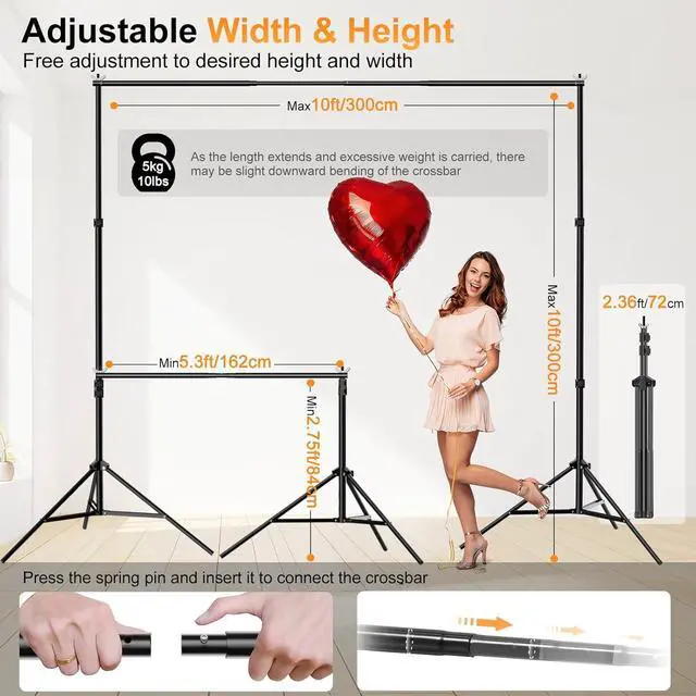 Photo Backdrop KitThe backdrop stand is designed to ensure stable support for your backdrop and it is suitable for most photography studios and shooting occasions. It can not only serve as a photography backdrop stand but also hold decorations such as balloons curtains and flags for parties weddings and some festival activitiesRetractable CrossbarThe retractable design of the backdrop stand makes the crossbar more flexible in use. Users can quickly adjust the crossbar between 5.3 ft and 10 ft as needed to adapt to different sizes of backgroundsConvenient and Stable Background StandOur tripod triggers are easier to adjust than knobs.