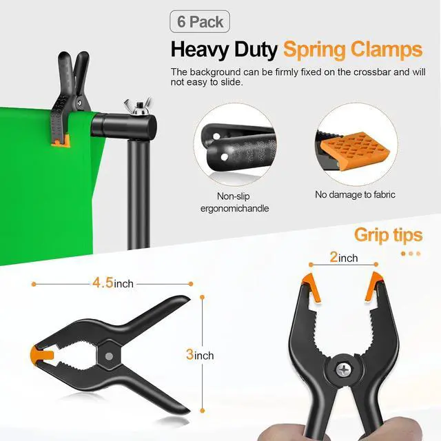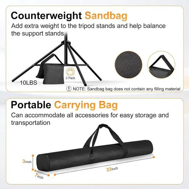 Made of aluminum material the design of the tripod base is stable enough to support the weight of backdrops while remaining stable and consistent. With a payload of up to 5 kg/11 lbs its strong to hang various backdropsAdded Quality Accessories 4.5 in heavy-duty clamps made of strong and rugged type of plastic grabs and stretches the backdrop tightly and present a better shooting effect. And 2 empty nylon sandbags can add extra weight and maintain stability when used. Packaging Contents (2) x 10 ft Adjustable tripod stand (2) x 5.3 ft Retractable crossbars (6) x Clamps (2) x Sandbags Carrying bag Manual.