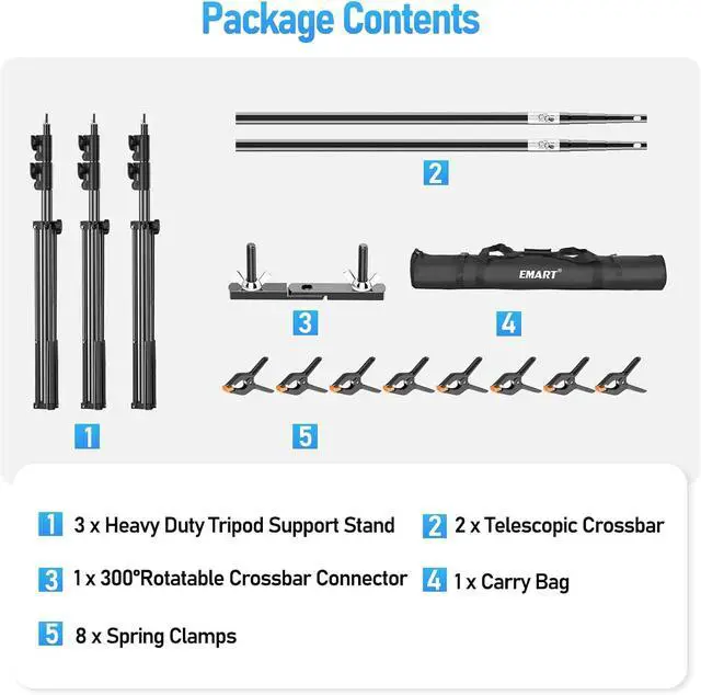 The Photo Backdrop Stand Includes3 x Heavy Duty Tripod Support Stand 2 x Telescopic Crossbar 1 x 300° Crossbar Connector 8 x Spring Clamp 1 x Carry Bag.