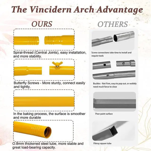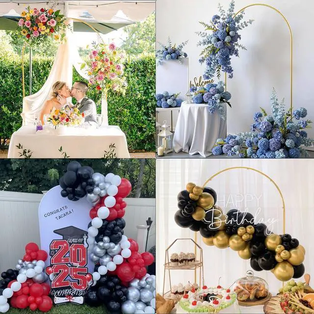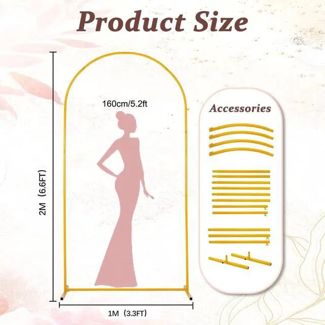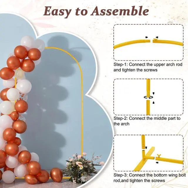 (Note: Color may vary slightly due to different monitor settings. )[Versatile Arch Backdrop]---Our gold backdrop stand can be used in weddings baby showers birthday parties other parties graduation ceremonies family get-togethers and any other celebration activities. Expressing richness in a simple form on a grand day with a Vincidern arch stand! [Metal Party Arch]---This metal wedding arch is crafted from thick steel tubing and we use a premium baking finish (not cheap spray paint) that means a flawlessly smooth surface that wont chip peel or rust easily. Ensuring your special day is supported by both elegance and strength. [About Assemble]----This arch arrives in many short sections and you need to assemble all the parts by yourself. Designed to save storage space and are easy to move. A step-by-step installation manual is included for hassle-free setup and no tools are needed. [Important Assembly Tip]----To ensure a stable assembly installation must start from the top curved tube connect the curved tube and the straight tube properly and then install the base. Otherwise you might end up with assembly issues.