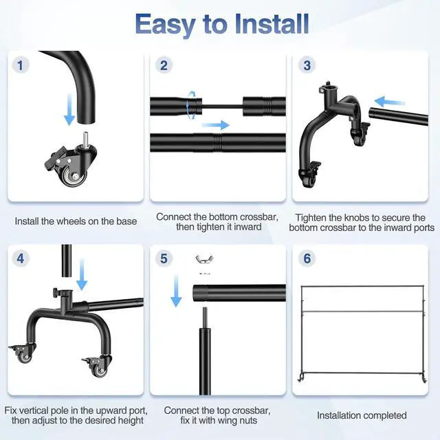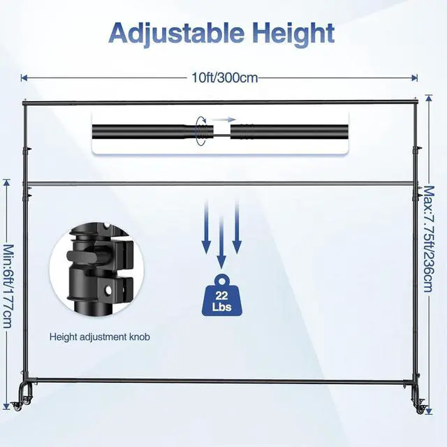 Upgrade moveable baseThe heavy duty photo backdrop stand kit comes with wheeled base. Compare with normal backdrop stand it increases the stability of the stand. The wheels have universal adjustment and shock absorption effect making it easy to move around. The wheel has brake to make it fixed in place no longer need to work hard to move the heavy backdrop. More stable & Space savingThe banner stand added ahorizontal pole at the bottom to increase the stability of the backdrop stand for parties. Different from tripod the compact vertical design will take less space and not easy to tip over.