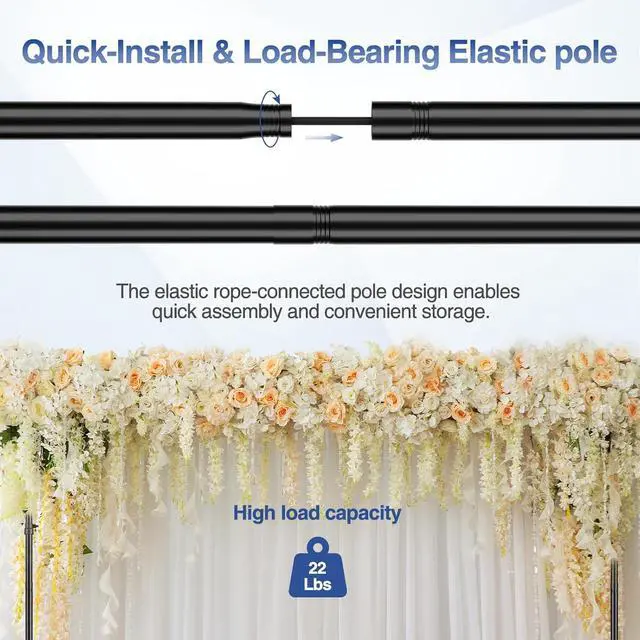 Quick-Install Elastic PoleThe backdrop stand for parties is designed for hassle-free setup. Its elastic ropes connect the parts eliminating the need to search for separate components and allowing for a quick installation process. The elastic pole supports various hanging decorations without bending. Easy to assembleThe photography backdrop stand is easy to assemble all connections can be manually attached or detached. You can easy set up background stand backdrop in minutes for your trade shows parties photo displays photography video recording etc. Multiple Use ScenariosThe party backdrop stand is perfect for trade shows parties wedding photo displays photography video recording store promotions engagement parties outdoor movie screening DIY photo booths pet photos and more.