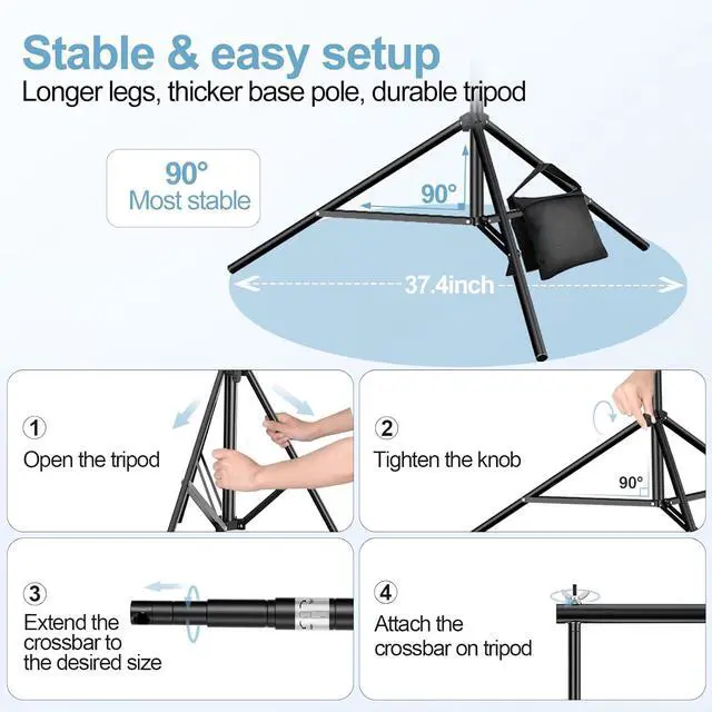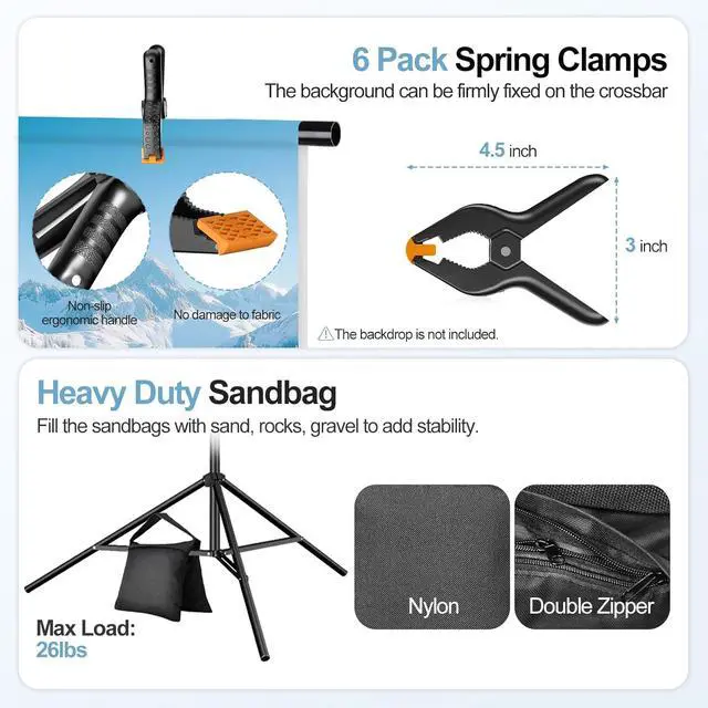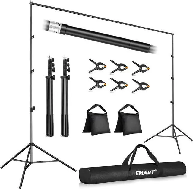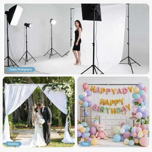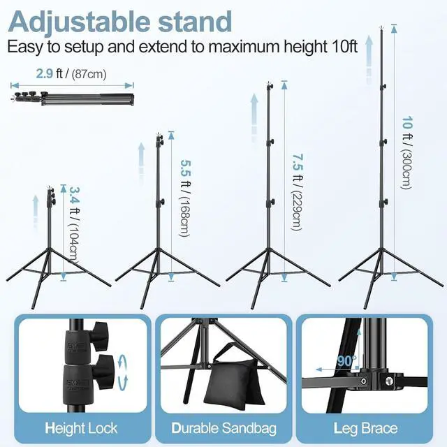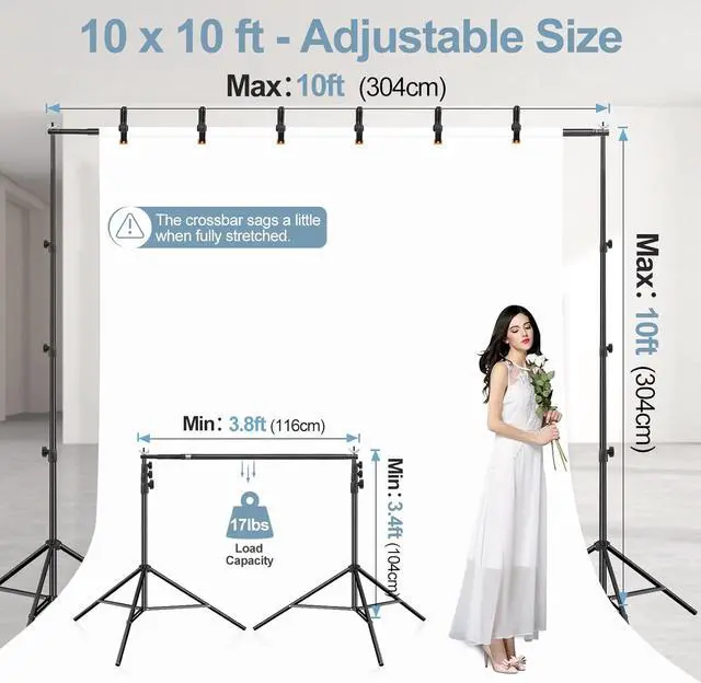 Backdrop Stand 10x10 Adjustable KitIncludes (2) x aluminum support stands (1) x adjustable telescopic crossbar (6) x heavy-duty 4.5 spring clamps (2) x weighted sandbags and (1) x carrying bag all essentials for creating perfect background stand backdrop setups. This professional-grade equipment includes everything you need ensuring a stable and reliable setup every time. Tripod Support StandThese robust tripod crafted from 100% aluminumengineered for professional use. The tripod legs feature an adjustable height range from 3.4 feet to a full 10 feet collapsing down to a compact 2.9 feet for easy transport and storage. The tripod structure provides a stable and secure base reducing vibrations and is perfect for event decorations studio shooting and dispaly.