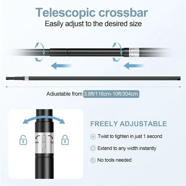 Lockable Telescopic CrossbarThis crossbar can be easily extended from 3.8 feet to 10 feet wide. Its user-friendly rotating locking mechanism is easy and quick to operate. This single crossbar design enables you to easily adjust the crossbar to the desired length in just a few seconds and it can be used to hang green screen flower wall backdrop and party backdrop etc. Complete AccessoriesThis photo backdrop stand includes 6 heavy duty 4.5 -inch spring clamps that can hold the photo backdrop banner and curtains in place without wrinkles 2 sandbags for adding weight and preventing accidental tipping and a durable carry bag for easy organization and carrying.