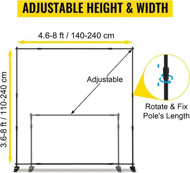 Adjustable Display Size: The backdrop frame features a telescopic design with adjustable width of 4.6 -8 ft/140-240 cm and an adjustable height of 3.6 -8 ft/110-240 cm. All poles are easily retractable by loosening the joints convenient to fit for banners or posters in different sizes.