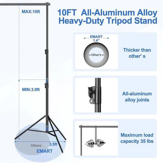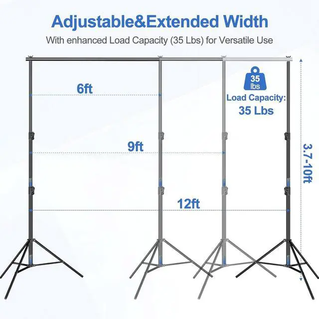Sturdy Heavy Duty Backdrop StandConstructed from 100% aluminum each tripod features a dual spring cushion system that absorbs impact and protects your equipment. The thickest tube diameter of the tripod for this photo backdrop stand kit is 1.4 inches making it stable and suitable for both indoor and outdoor use. High Load-bearing Capacity Crossbar x4Easily connect multiple crossbars to extend the width from 72 inch/6 ft to 144 inch/12 ft. With a strong load-bearing capacity of up to 35 lbs these crossbars securely hold various thick backdrops such as green screen banners flower wall balloons drapes or backdrop curtains without easily sagging.