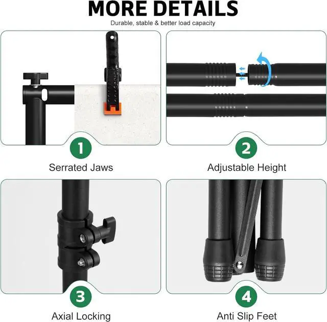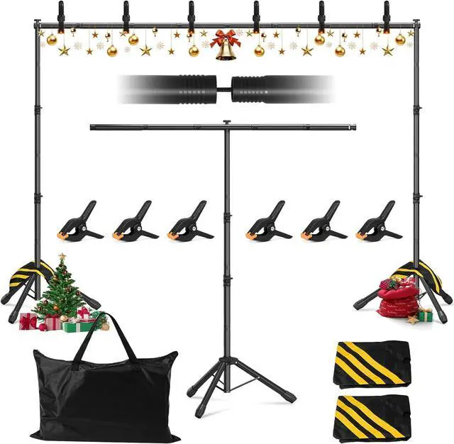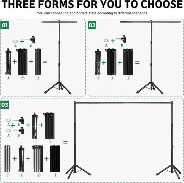 [3-in-1 Adjustable Backdrop Stand] This backdrop stand kit can be set up as a full 10x 7.5 ft background stand or converted into two T-shaped stands. Height adjusts from 3 to 7.5 ft and width from 3.85 to 10 ft offering flexible setups for photography video events and more[Strong & Reliable Accessories] Reinforced crossbars matching-diameter clamps and sturdy connectors keep backdrops secure. Designed to hold heavier fabrics and paper rolls without bending or slipping for a professional worry-free shoot[Quick Assembly & Portable Design] No tools neededassemble or take down in under 3 minutes. Each part is clearly labeled for easy setup.