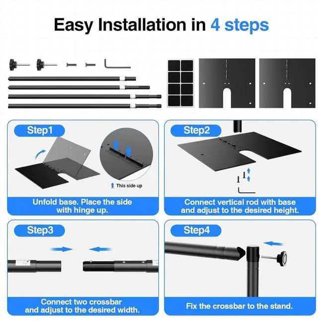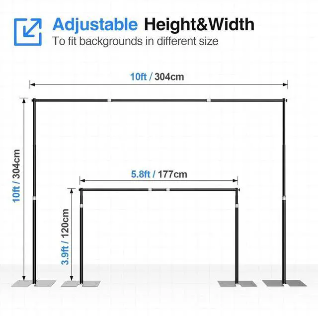 [Sturdy & Durable] This support system features built with high-quality metal the sturdy thickened pipe and the durable steel base ensures stability making it ideal for backdrop stands drapes and photography setups[Adjustable for any space] With an adjustable height range of 3.9 to 10 feet and a cross bar width of 5.8 to 10 feet it offers maximum flexibility for your event needs. Whether youre setting up for a birthday party studio photography or outdoor events this system adapts to any space[Unobstructed design for foot] The heavy-duty flat base weighing 9.26 pounds it won't catch your feet when you pass by ensures stability and prevents tipping.