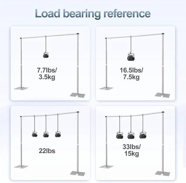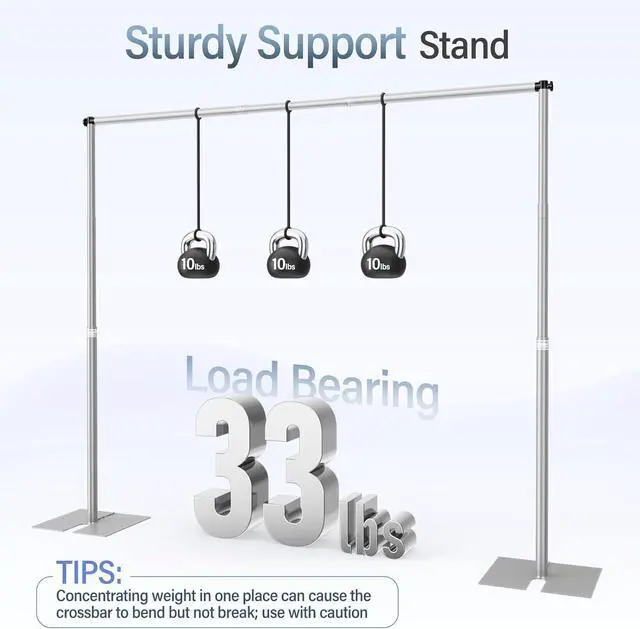 SUPPORTS UP TO 33 LBS - EMART heavy duty backdrop stand supports up to 33 pounds with thickened pipes and an expanded base for enhanced stability. Made from aluminum and steel it offers rust resistance and high structural strength ensuring both durability and sturdinessSTABLE AND COMPACT BASE - Featuring flat metal bases each weighing 9.26 lbs our pipe and drape stand offers stable support with a large contact area. The foldable space-saving design prevents tripping and ensures easy assembly and storageEASY SIZE ADJUSTMENTS - Our 10x10 adjustable backdrop stand offers a telescopic design for flexible sizing. Easily adjust frame width from 5.6 to 10 ft and height from 3.9 to 10 ft.