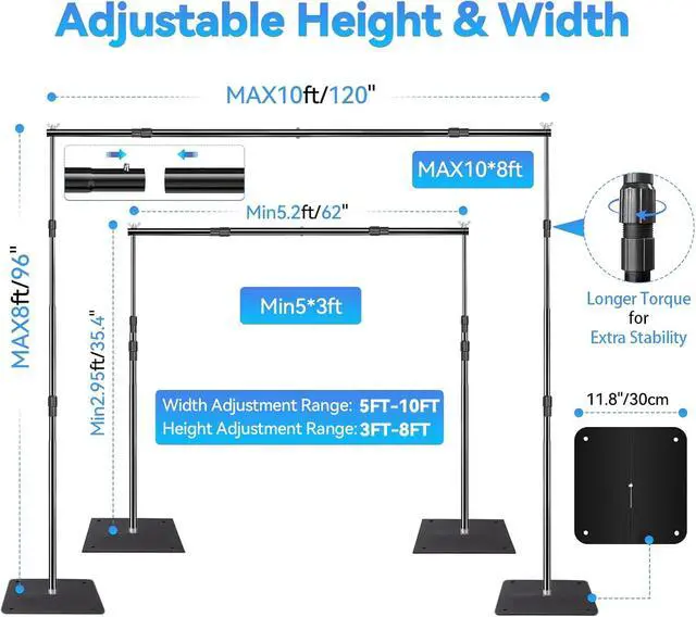 Adjustable Height & Width: Built with heavy-duty carbon steel the frame offers height adjustability from 3.7 ft to 8 ft and a telescopic crossbar width from 5.3 ft to 10 ft. Easily customize the size to match your event or shoot.