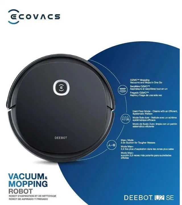 The ECOVACS DEEBOT U2 SE robot vacuum cleaner and mop with WiFi & app control is a smart, allinone floor cleaning solution built to keep your home spotless with minimal effort, featuring powerful suction, efficient mopping, and intelligent navigation that works on hardwood, tile, laminate, carpet edges, and everyday messes while you multitask. Perfect for users searching for an ECOVACS robot vacuum, DEEBOT U2 SE cleaner, robot vacuum and mop combo, WiFi smart vacuum, appcontrolled robot cleaner, smart home floor cleaner, selfcharging robot vacuum, automatic home vacuum, pet hair vacuum robot, scheduled cleaning robot, smart floor cleaning device, robot vacuum for hardwood and tile, robot mop and vacuum, or touchless home cleaning solution, this model delivers convenient app control, cleaning modes, scheduled cleanups, easy maintenance, and the trusted innovation of ECOVACS, ensuring efficient and handsfree vacuuming and mopping for everyday home care.