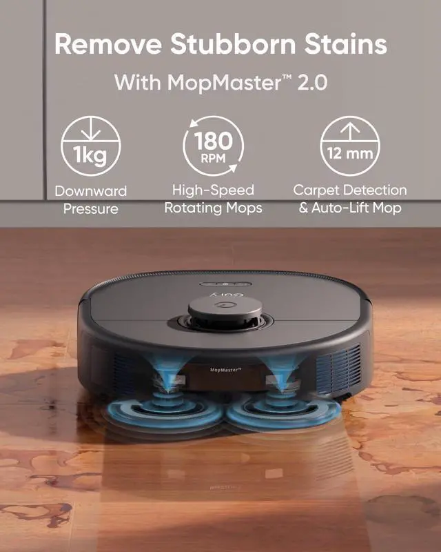 • MopMaster 2.0 Technology: Whether you're tackling carpets or hardwood, its advanced technology gently yet effectively cleans every surfaceideal for those seeking the best robot vacuum for carpet and hard floors.