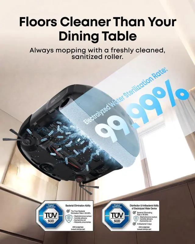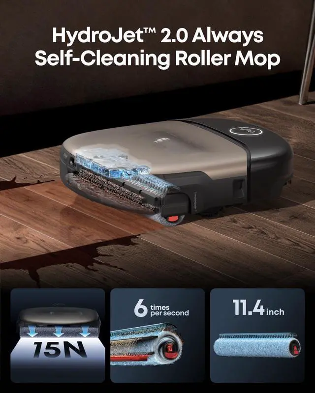 : HydroJet 2.0 self-cleaning roller mop uses real-time electrolyzed water to eliminate 99.99% of germs on every pass scientifically sanitizing, not just rinsing with clean water. Safe for crawling babies, toddlers & barefoot families.140°F hot-water wash after every cycle keeps mop pads fresh & bacteria-free.