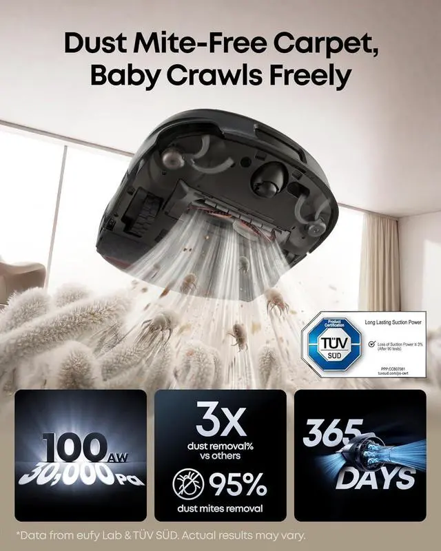 - -: 30,000 Pa AeroTurbo 2.0 fade-free suction with 100AW airflow reaches 3cm into carpet fibers, removing 95% of dust mites, pet dander & allergens. Perfect for thick carpets, multi-pet homes & allergy concerns.