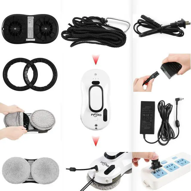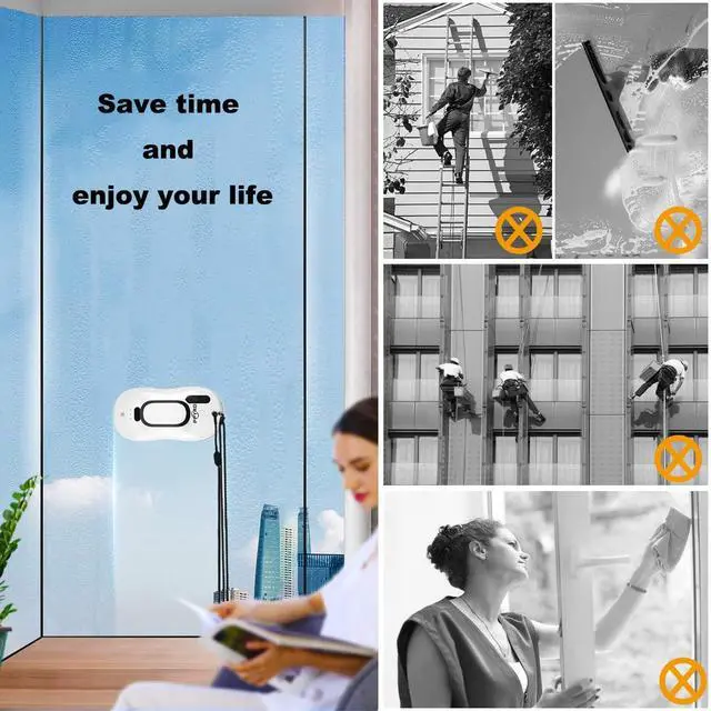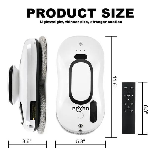 The window cleaning robot uses intelligent AI technology path calculation, and the robot can work on multiple surfaces, such as glass, tiles, smooth walls and tables. A built-in vacuum motor helps the robot inhale and stand on the glass surface. A built-in UPS power supply allows the robot to suck on a window for 20 minutes without direct power.
