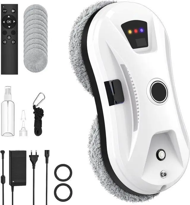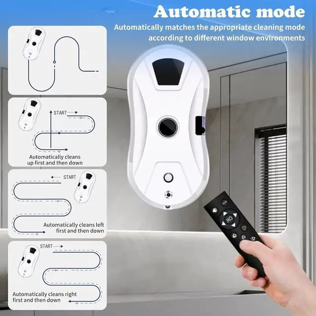 • The robot window cleaner features a double-helix cleaning head and a microfiber cleaning cloth. It automatically detects window frames and obstacles, ensuring efficient, scratch-free cleaning.