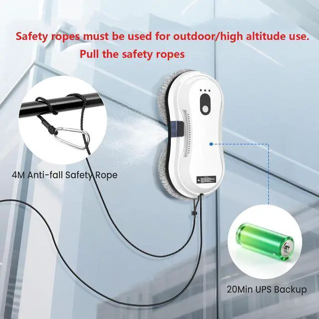 • Triple Safety System Ensures Safe Cleaning: The window cleaning robot utilizes advanced vacuum motor technology, providing a powerful 5600Pa suction force, ensuring a secure attachment to the window during operation. It also features a UPS energy storage system, ensuring continuous operation for up to 20 minutes even in the event of a power outage. The high-strength 4-meter safety tether provides additional protection against falls.