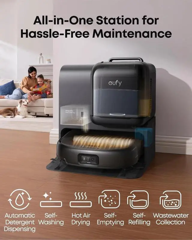 All-in-One Station With self-emptying, self-washing, hot air drying, automatic detergent dispensing, wastewater collection, and self-refilling, you can enjoy a hands-free experience.