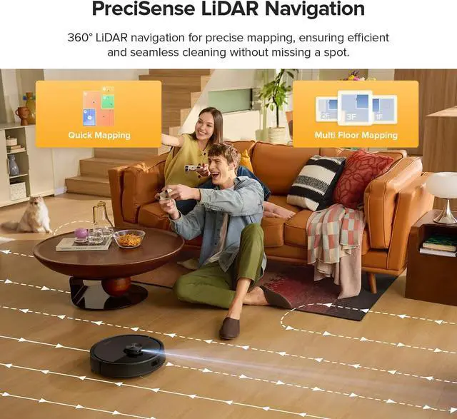 5. Smart Navigation with Precise LiDAR: Quickly scans and builds precise maps in seconds, finding the optimal cleaning route for your home. You can visualize your home and add furniture, pet supplies, and flooring materials to the app.