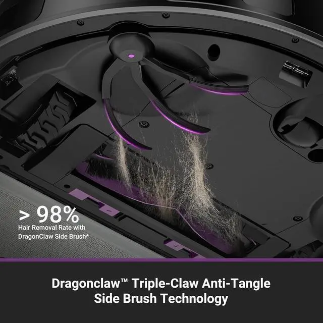 ANTI-TANGLE TECH FOR PET HAIR: The DragonClaw Side Brush and anti-tangle roller eliminate hair wraps and clogs with over 99.99% removal efficiency. Built-in comb clears hair while you relax.
