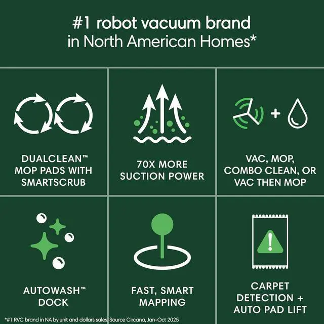 1. STRONG SUCTION SERIOUS MOPPING. Devours messes from crumbs to pawprints with 70x more suction*, DualClean Mop Pads, SmartScrub, a multi-surface rubber brush, and edge-sweeping brush *As compared to Roomba 600 series robots