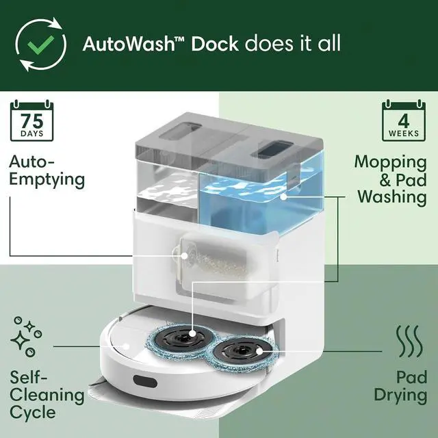 AUTOWASH DOCK DOES IT ALL. 75 days of auto-emptying, 4 weeks of mopping and pad washing*, continuous pad refreshing, and pad drying ensure an ultra-effective clean day after day. *Based on 1 mopping run per week