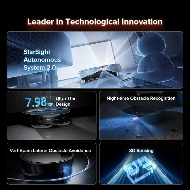 StarSight Autonomous System 2.0: Experience smarter cleaning with advanced 3D sensing technology, enabling precise mapping even under narrow-legged furniture and suspended cabinets. The innovative VertiBeam Lateral Obstacle Avoidance system navigates cables and irregular furniture with ease, cleaning along cords without manual intervention. Enhanced algorithms detect and adapt to 108 obstacle types, ensuring seamless and efficient cleaning across every corner of your home.