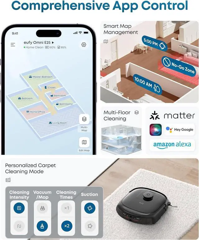 - & - Precision mapping remembers up to 5 floor plans with auto floor switching. 125-minute runtime (vacuum + mop, standard mode) cleans large homes in one session. Operates at 61dB (max mode).
