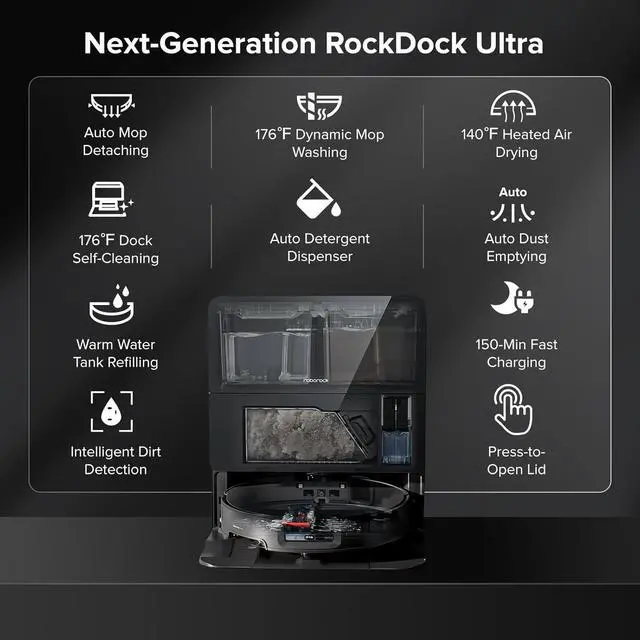 New Gen Powerful Rockdock: The New Generation RockDock Ultra is an advanced docking station featuring 176°F hot water mop washing, dynamic temperature settings for different stains, 140°F heated air drying, and self-cleaning with warm water. It includes an intelligent dirt detection system, auto detergent dispenser, self-refilling, fast charging, and off-peak charging, ensuring a spotless home with minimal effort.