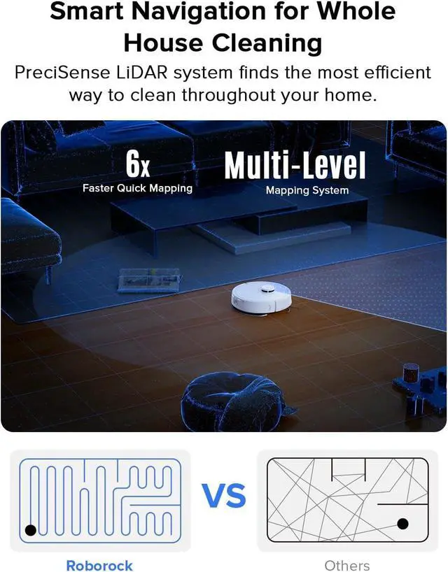 Precision LiDAR Navigation: 360° laser mapping scans your home in real time, plans the most efficient route, and saves multiple floor maps for easy navigation