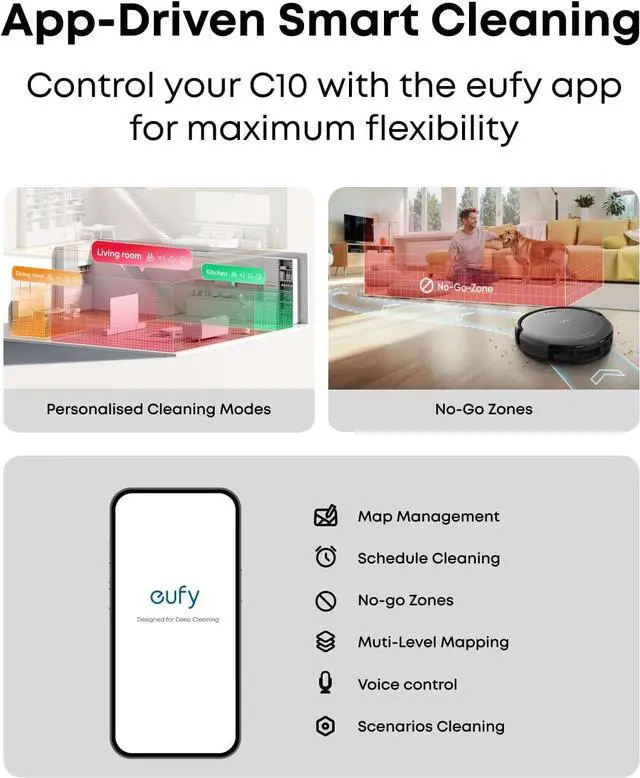 Laser Navigation: The C10 robot vacuum self-empties and navigates effectively, creating optimized cleaning paths throughout your home for a thorough clean. You can also set up customized cleaning and scheduled cleaning while you're away or busy.