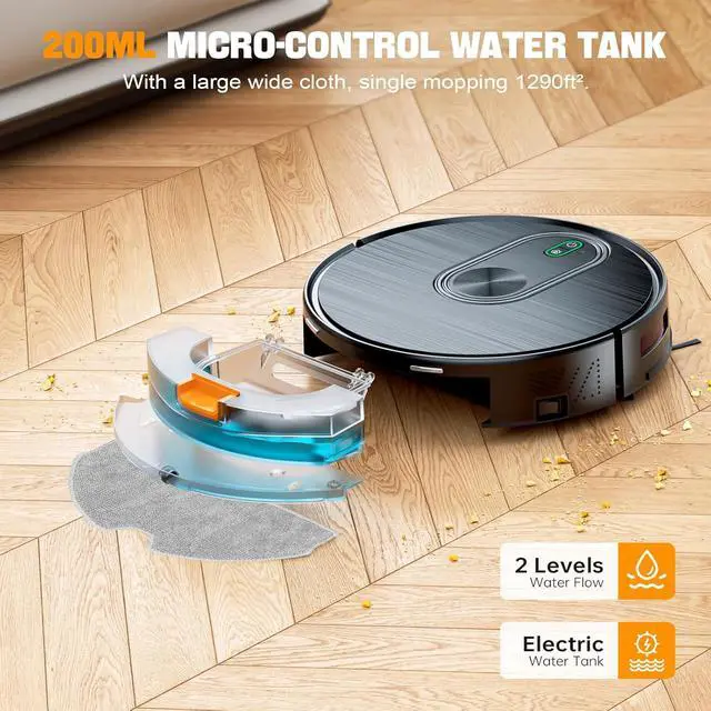 2-in-1 Robot Vacuum & Mop The E8S seamlessly combines powerful vacuuming with intelligent mopping. Its 300ml large-capacity dustbin effortlessly collects dust, debris, and pet hair, while the 200ml precision water tank ensures even moisture distribution on hard floors. Adjust water flow via the app or remote control to precisely handle both dry and wet cleaning scenarios. The robust suction motor paired with a rotating brush delivers a hands-free cleaning experience. Note: When using the robot vacuum, press the side button first, then press the power button.