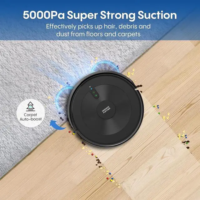 5000Pa Strong Suction & Robot Vacuum and Mop in One-Go:This robot vacuum with 5000Pa powerful suction can effortlessly tackle dust, crumbs, and stubborn pet hair on hard floors, tile, carpets, etc. Ideal gift for pet family . It also supports mopping simultaneously with a 230ml water tank equipped, saving your time and effort for a truly comprehensive clean.