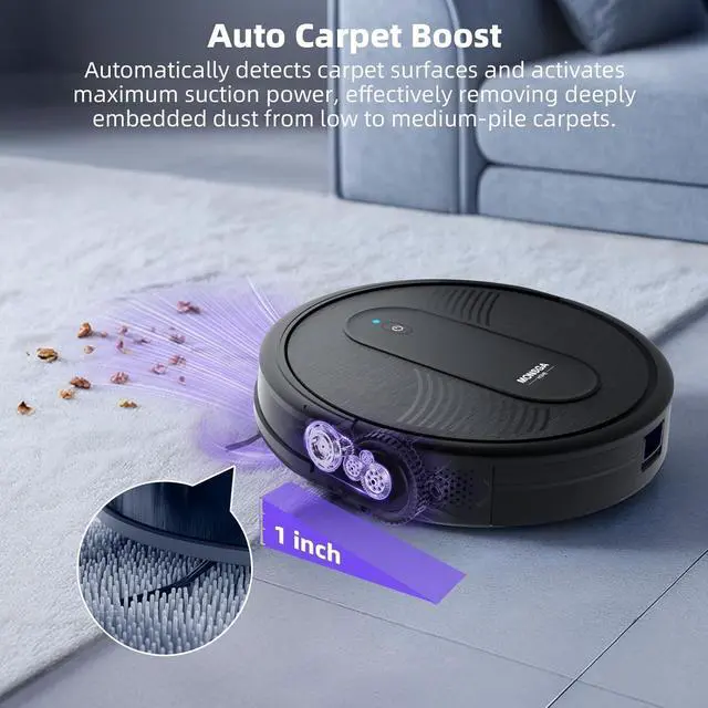 140 Min RuntimeMONSGA robot vacuum cleaner runs 140 minutes straight, tackling up to 1,500 sqft on a single chargeperfect for large homes or multi-zone cleaning. When battery drops below 15%, it automatically returns to its dock to recharge, ensuring it's always ready for the next clean. No more dead batteries mid-task
