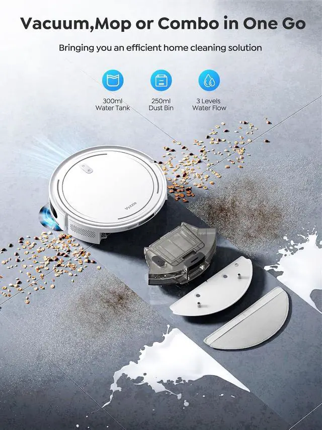 3-IN-1 SWEEPING, VACUUMING & MOPPING: The robot vacuum and mop combines sweeping, vacuuming, and mopping in one device, delivering a true all-in-one cleaning solution. With 3 adjustable suction levels and 3 water flow settings, it easily adapts to hard floors and tiles, as well as carpets and rugs, for everyday cleaning needs.