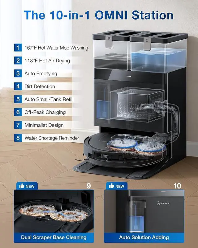 10-IN-1 OMNI STATION HANDS-FREE MAINTENANCE - The OMNI Station handles all maintenance167°F hot water mop washing, 113°F hot air drying, auto dustbin emptying, water refilling, and dirt detection. It even auto-dispenses cleaning solution, ensuring a deep, hands-free clean every time.