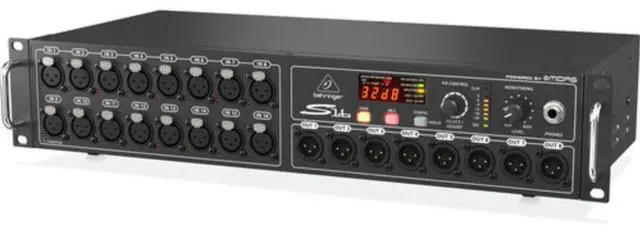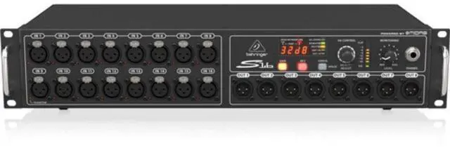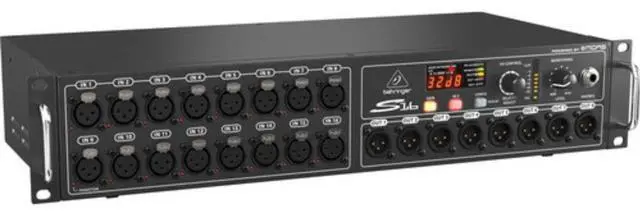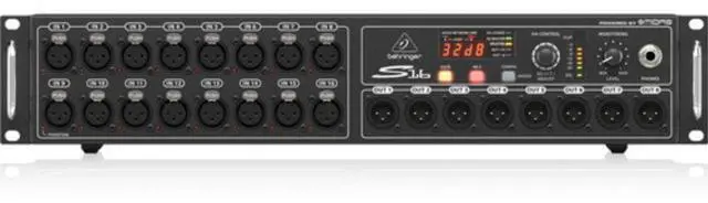 Behringer S16, a digital I/O stage box with 16 fully programmable, remotely controllable Midas-designed mic preamps and 8 analog, balanced XLR outputs. The stage box connects to the FOH through a single Cat 5e cable without the need for a dedicated router.