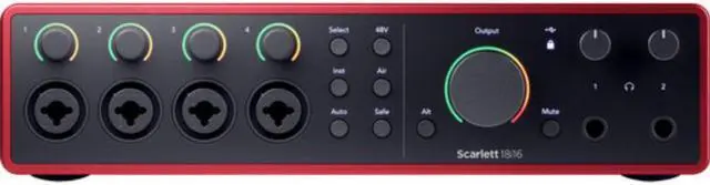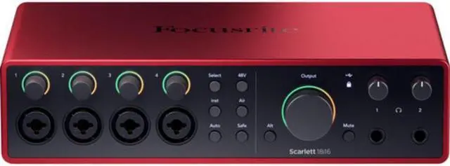 Focusrite Scarlett 18i16 (4th Generation) 18-in / 16-out USB-C audio/MIDI interface lets musicians, producers, and creators capture high-quality audio with no learning curve, no matter where they go. The 4th Generation model features four ultralow-noise microphone preamps with up to 69 dB of gain to capture the full potential of your mics. The flagship, RedNet 24-bit / 192 kHz AD/DA converters provide a huge dynamic range up to 122 dB, matching the quality you'd find in a pro studio. The new Auto Gain mode automatically sets your recording level, and the Clip Safe mode automatically prevents your signal from clipping, ensuring every take is a keeper. The Loopback feature lets podcasters, gamers, YouTubers, and streamers mix audio from other apps running on the computer. The 18i16 4th Generation works in standalone mode without a computer, useful for live performances or monitoring-only situations. Bundle with XLR- XLR Cable (2 Pack), Hosa Mid-310 Black 10 ft. Midi cable (2 Pack).