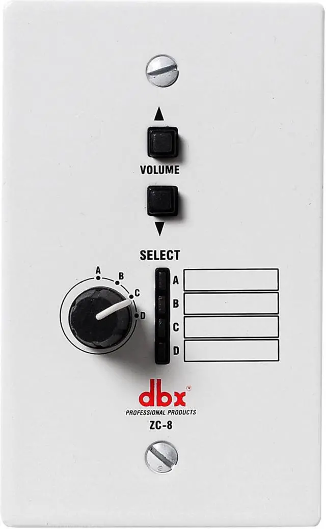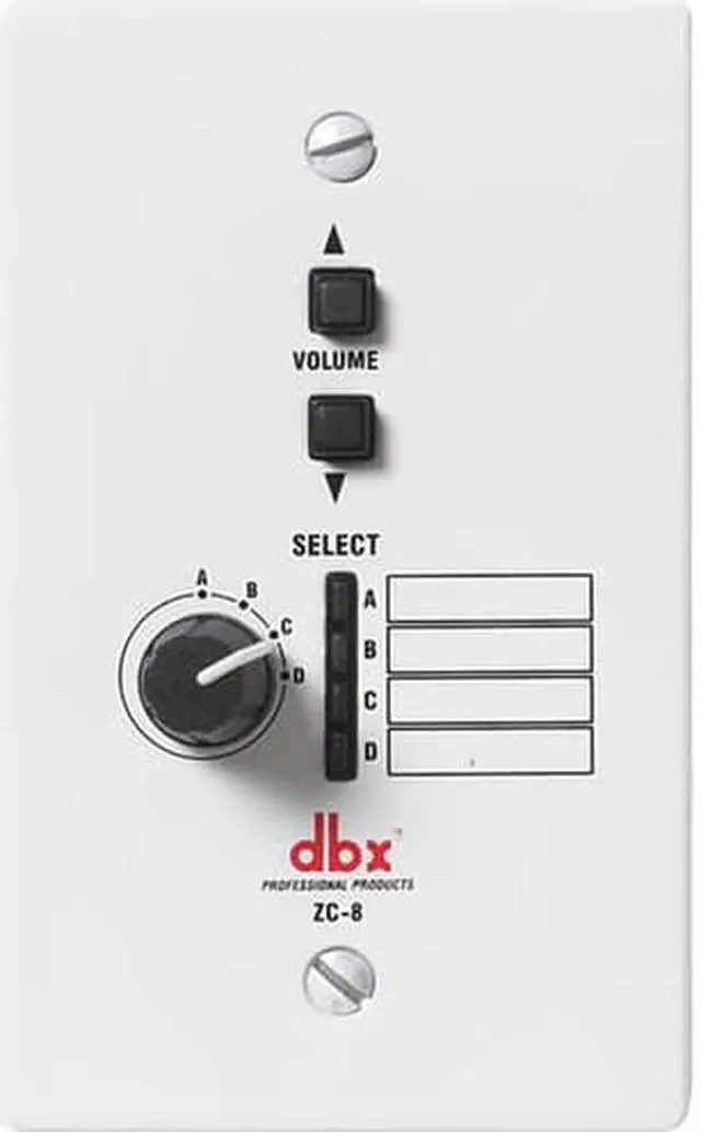 The remote device shall provide both programmable push-button up/ down volume control, and programmable rotary switch source selection for the dbx ZonePro devices. The remote device shall have DIP switches allowing identification with connection to the processing device via CAT 5 cable on RJ-45 connectors. The device shall be a dbx ZC-8 remote controller. Also known as -DBX ZC-8 Source Selector and Volume Control for ZonePro-DBX ZC-8 Remote Wall-Plate Mounting Volume and Source Controller for dbx ZonePro