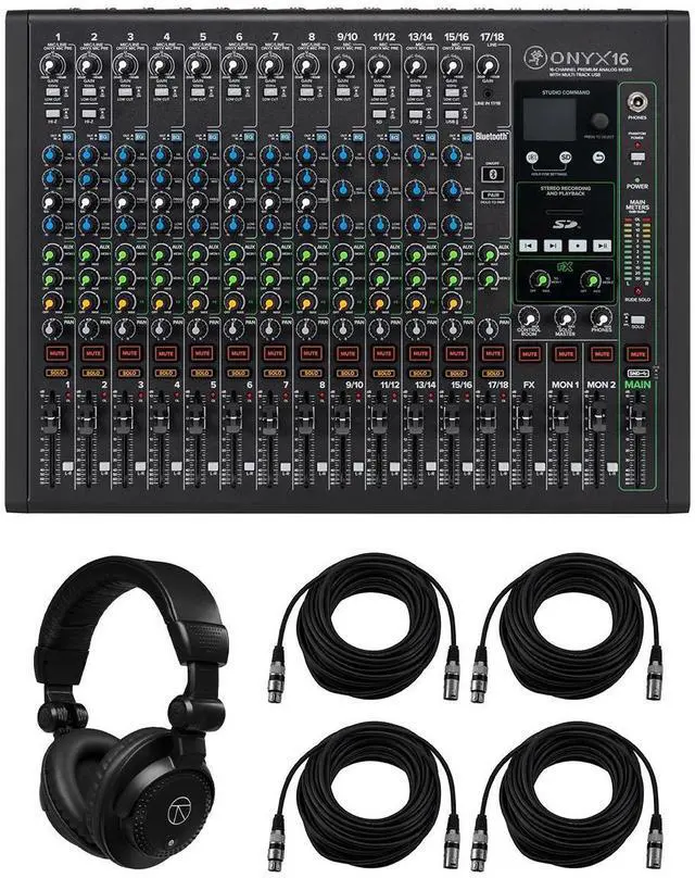 Access a digital library of customizable digital effects that you can quickly save and recall during studio sessions or band rehearsal. Spend less time menu-diving and more time making music. Studio CommandThere's nothing like feeling in control of your workstation. Mackie Onyx16 mixers feature powerful full-color LCDs with dedicated physical transport controls. Apply FX and recall up to six customizable presets using an intuitive single-knob interface. Record a stereo mix, browse files and play music direct to/from an SD card, all via Studio Command. Bluetooth StreamingBluetooth is a gamechanger on an analog mixer.