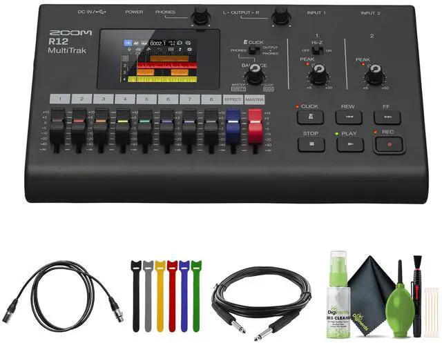 The Zoom R12 MultiTrak is built for musicians who need a compact, portable solution for recording and producing music without a computer. It offers 8-track recording at 24-bit / 44.1 kHz, two XLR-1/4" combo inputs with phantom power, and intuitive touchscreen editing on a full-color 2.4" LCD. With 150 preloaded drum loops, a built-in FM synthesizer, and effects including reverb, chorus, and delay, the R12 provides versatile tools for creating complete songs. A dedicated click track, compression on inputs 1 and 2, pan, and 3-band EQ per track give you full control over your mix.
