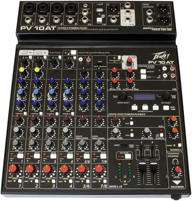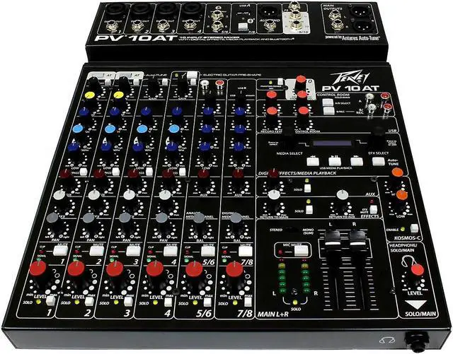 The all-new PV 10 AT mixers come equipped with Antares Auto-Tune pitch correction, a technology that can literally help anyone sing in key and is used on professional recordings and live performances throughout the world. This technology is incorporated directly into a complete and powerful portable mixing solution, ensuring that your audience will experience perfectly tuned vocals to complement the crystal-clear audio of the mixer. Features such as Bluetooth® allow seamless connection to almost any "smart" device. Multiple direct outs per channel allow easy connection to most DAW interfaces for recording. In addition, these mixers can stream audio directly to a PC. MP3 playback is also available via USB A port and LCD display. With a slim, low-profile design, PV AT series mixers are ideal in small to mid-size venues. Key features include 2 channels of Antares Auto-Tune, 4 channels of reference-quality mic preamps, 4 direct outputs for recording, Bluetooth wireless input, and built-in digital effects with LCD display. These all-new mixers will provide years of hassle-free operation.