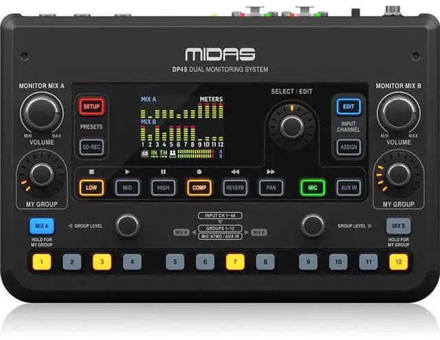 Enjoy a refined personal monitor mixing experience with the Midas DP48, a dual 48-channel personal monitor mixer that allows 2 performers to fully control their monitor mixes and hear exactly what they want. The DP48 also includes a built-in SD recorder to record and playback rehearsals and performances.